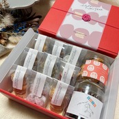 小麦粉(国内製造)、バター、砂糖、アーモンド、さつまいも、チョコチップ、キャラメルチョコチップ、ホワイトチョコチップ、コーンスターチ、卵、ココアパウダー、キャラメルパウダー、抹茶、紫芋パウダー、チョコレート、ドライ苺、胡麻/乳化剤、香料(一部に小麦、卵、乳、大豆を含む)