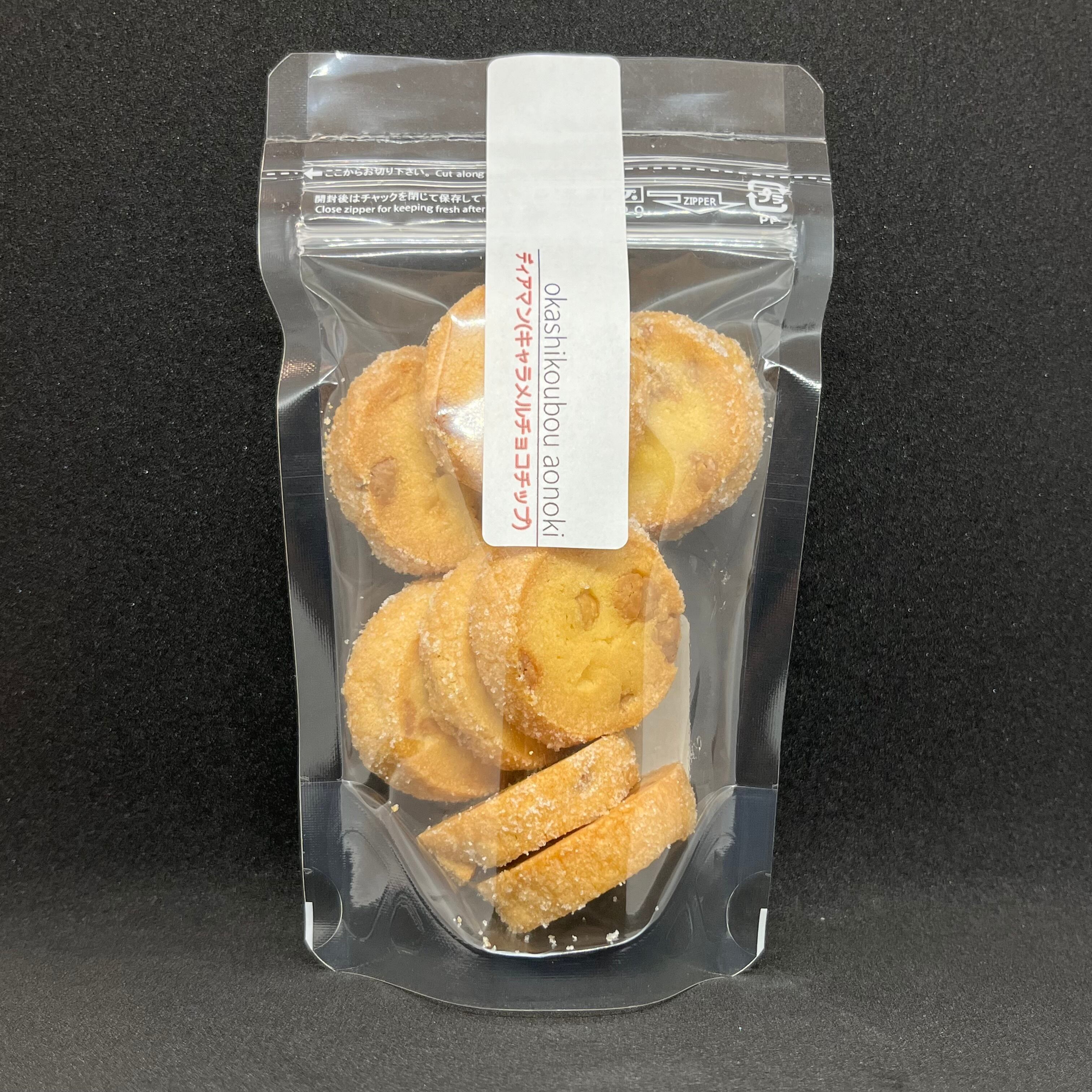 【ディアマン キャラメルチョコチップ】小麦粉(国内製造)、バター、グラニュー糖、アーモンドパウダー、コーンスターチ(遺伝子組み換えでない)、卵黄、植物油脂、全粉乳、乳糖、キャラメルパウダー、ココアバター、デキストリン、ココアパウダー、カカオマス/乳化剤、香料、着色料(アナトー)(一部に小麦、卵、乳、大豆を含む)
