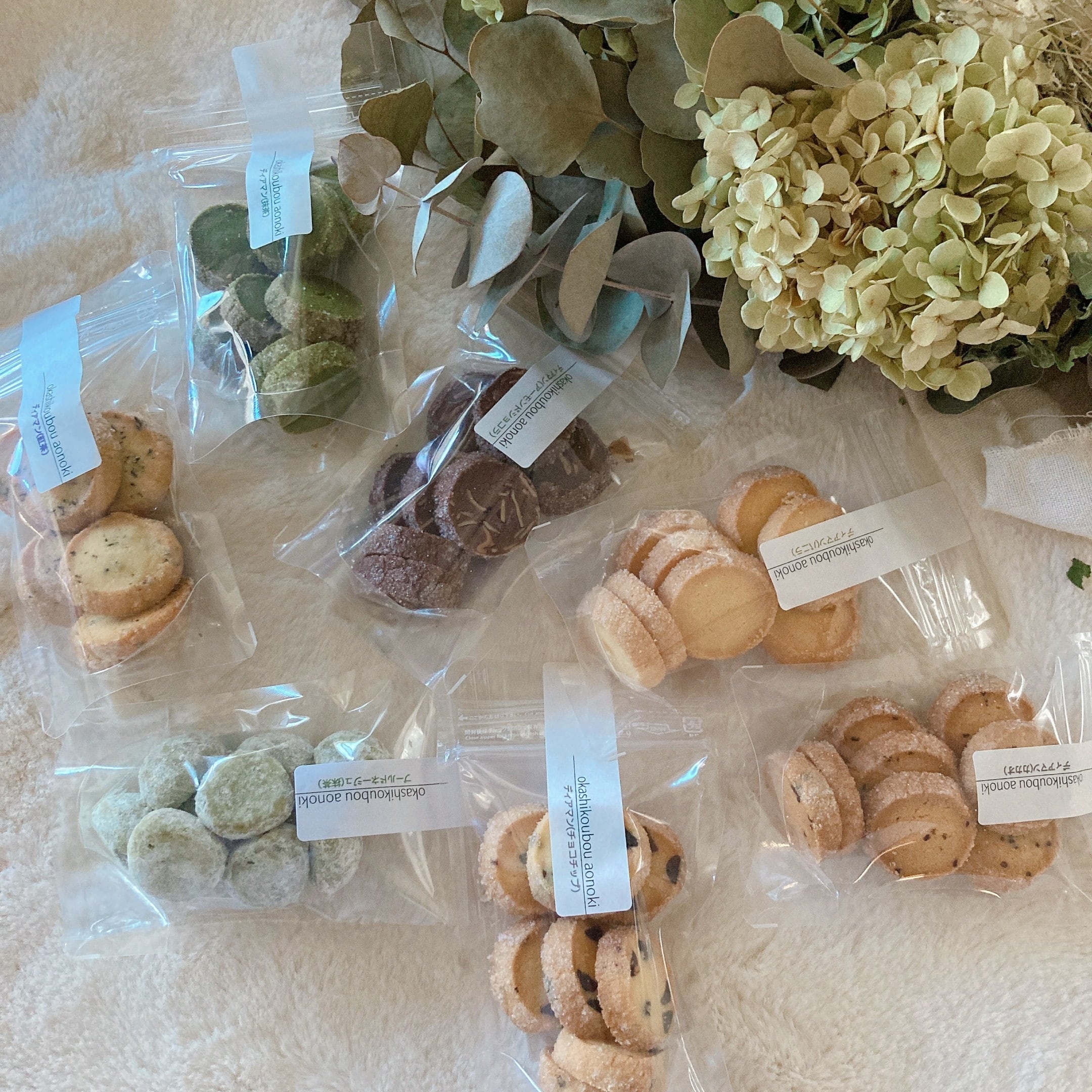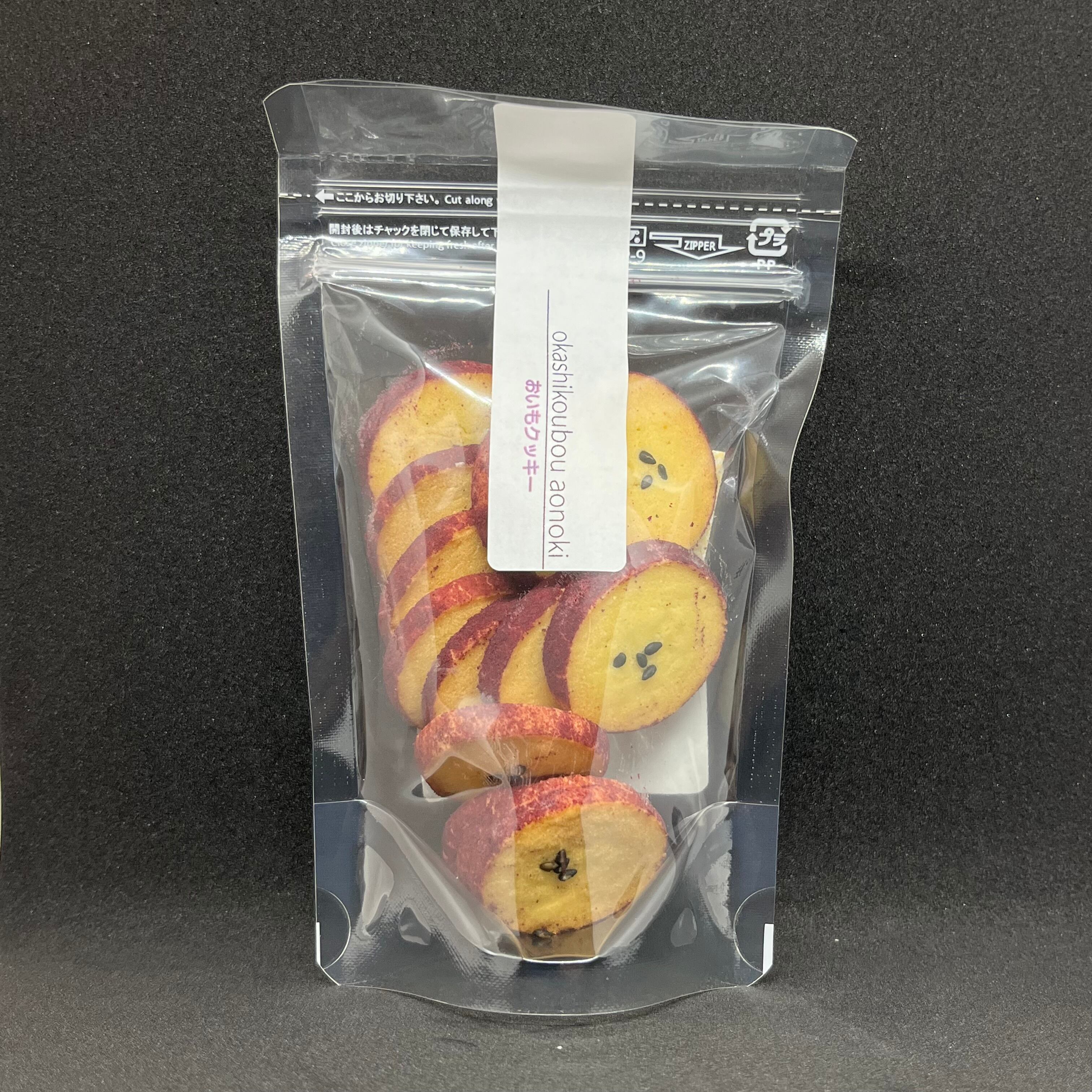 【おいもクッキー】小麦粉(国内製造)、バター、グラニュー糖、さつまいも、卵、紫芋パウダー、黒ごま、(一部に小麦、卵、乳を含む)