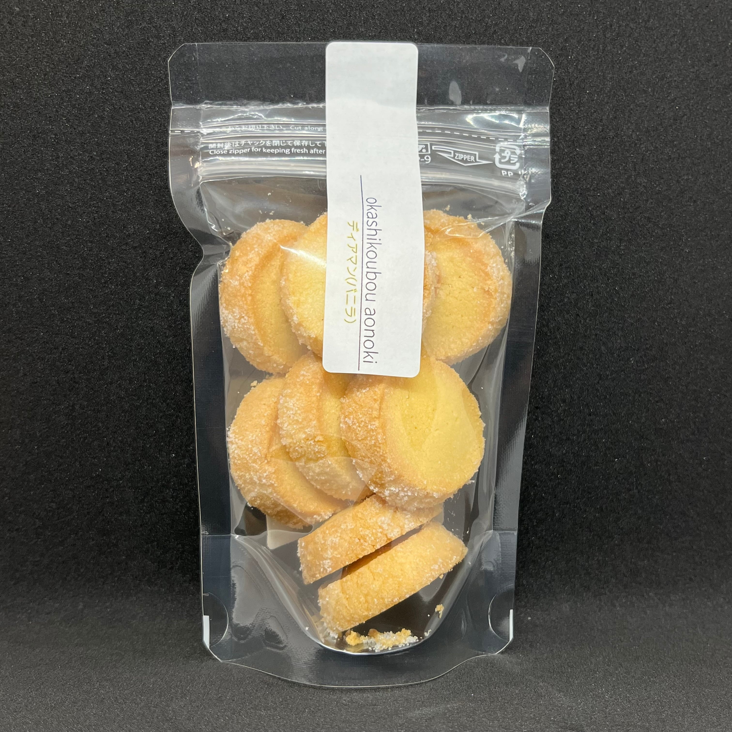 【ディアマン バニラ】小麦粉(国内製造)、バター、グラニュー糖、アーモンドパウダー、コーンスターチ(遺伝子組み換えでない)、卵黄/香料、(一部に小麦、卵、乳を含む)